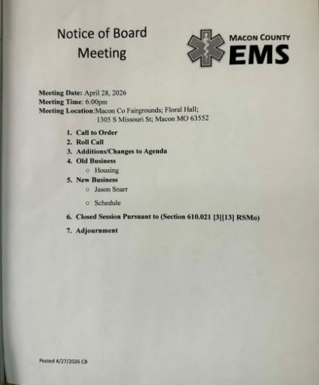 MACON, Mo. — The Macon County Ambulance District Board of Directors meets at 6 p.m. Tuesday, April 28, 2026, at the Macon County Fairgrounds Floral Hall, 1305 S. Missouri St., Macon, with the contested 48/96 shift schedule on the agenda as a new business item.